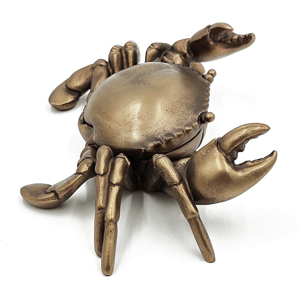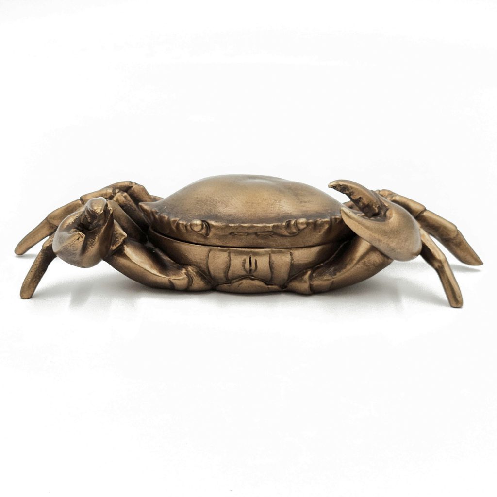 Blending coastal charm with versatile function, this decorative box is crafted in the likeness of a crab, with realistic detailing and a warm copper finish pairing to create an eye-catching home accent. Whether used to hold jewelry, keys, or small household essentials, it will fit perfectly onto any dresser, tabletop, mantel, or sideboard.