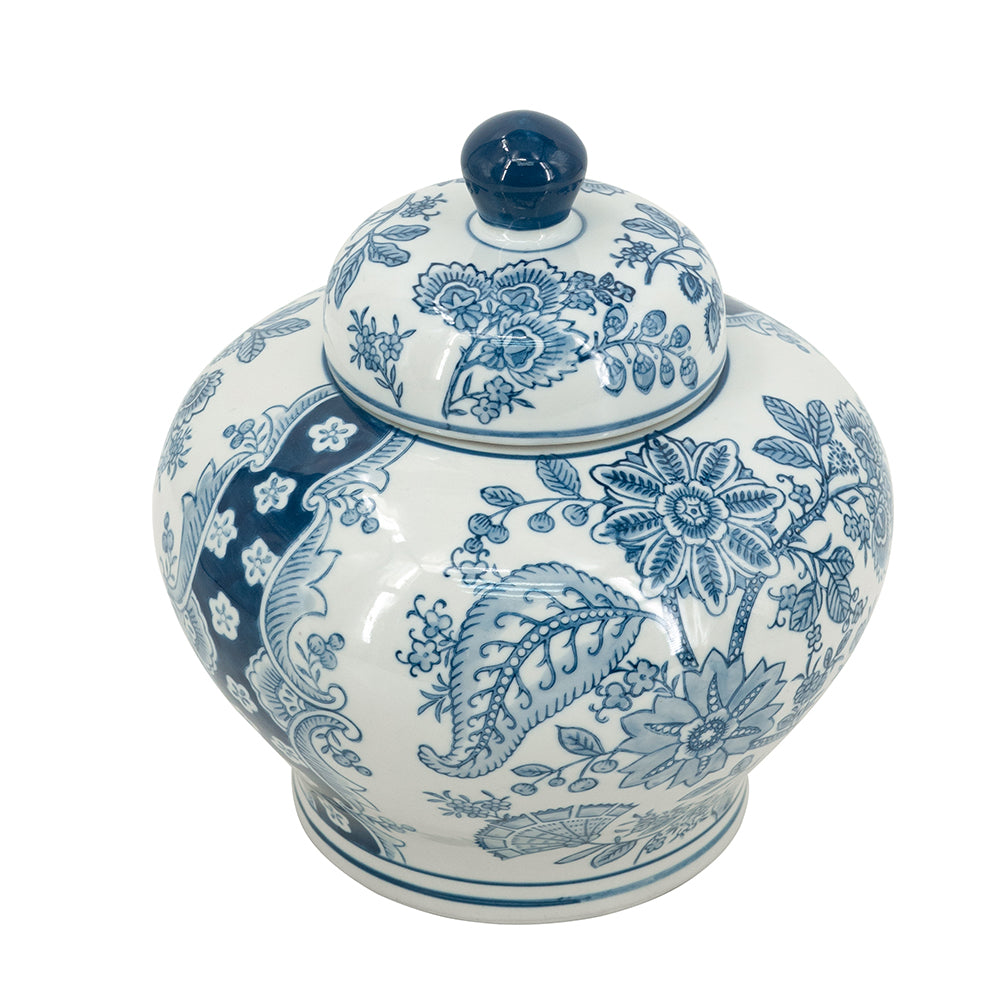Drawing inspiration from the graceful beauty of Ming Dynasty designs, this decorative jar features a wide, curving silhouette, a removable lid, and a series of detailed blue floral motifs that weave through the crisp white porcelain.