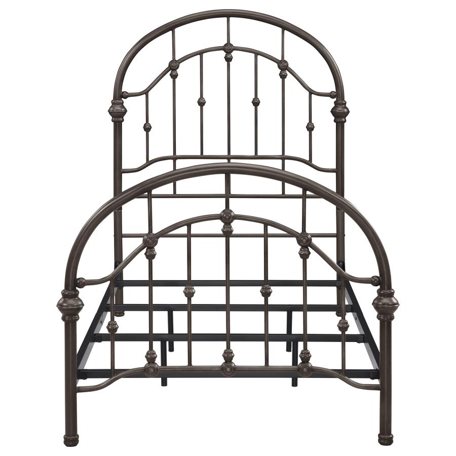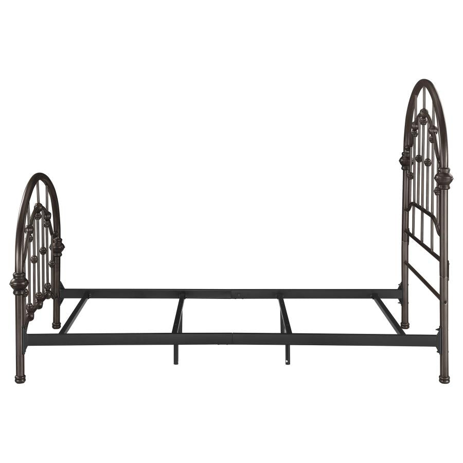 Add timeless appeal to your bedroom with this vintage-inspired metal bed frame, finished in a rich dark bronze for added sophistication. Featuring arched headboard and footboard designs with intricate detailing, this frame is crafted from heavy gauge metal for durability. Secure metal slats provide stable support for a box spring and mattress, combining elegance with functionality. Perfect for traditional or modern bedroom styles.